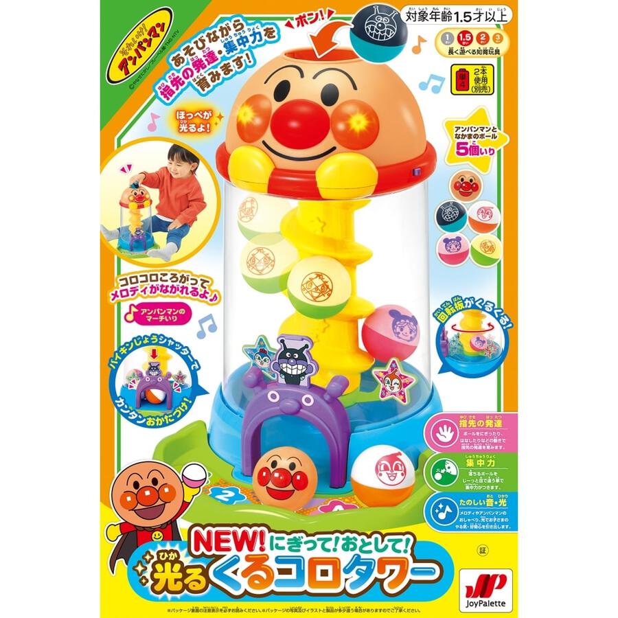 將附帶的滾珠放入麵包超人的頭部,會發出「砰!」的一聲,滾珠滾動時,會播放一段旋律並發出聲音,麵包超人的臉頰