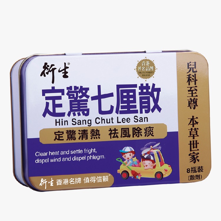 衍生定驚七厘散 可定驚清熱,祛風除痰。由天麻、鈎藤、蟬蛻、僵蠶、人工麝香等成分精製而成,特別加入體外培育牛黃,能夠有效定驚清熱,對BB夜醒爆喊係非常有效。