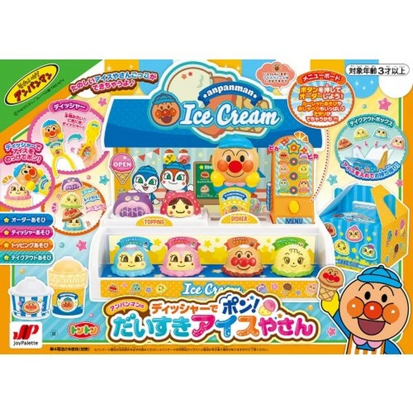 用冰淇淋勺挖一些冰淇淋,擠壓手柄,冰淇淋就會彈出!把它放進蛋筒或杯子裡,盡情享用吧!雙倍!三倍!各種食材!把它們堆疊起來,盡情享受冰淇淋店的樂趣♪按下會說話的菜單板上的按鈕,麵包超人和細菌人就會和你說話。當你打開輪盤時,燈會閃爍,你可能會獲得一張中獎券☆你還可以把冰淇淋放進外賣盒裡,玩外賣遊戲!有4種可愛的冰淇淋和2種配料☆